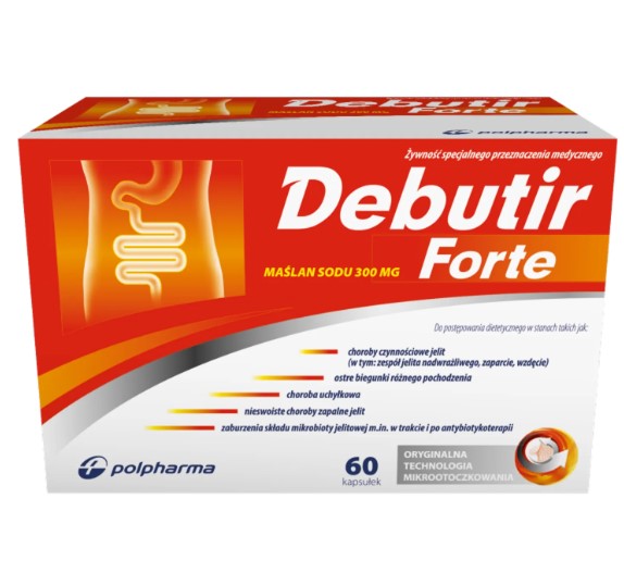 Debutir Forte to żywność specjalnego przeznaczenia medycznego w postaci kapsułek, która zawiera sól sodową oraz kwas masłowy. Wspomaga proces odżywiania pacjentów z chorobami układu pokarmowego. Kwas masłowy jest podstawowym materiałem energetycznym dla nabłonka jelit. Zastosowanie w produkcie Debutir Forte nowoczesnej technologii granulacji soli sodowej kwasu masłowego w przeciwieństwie do standardowych postaci maślanu sodu zabezpiecza go przed całkowitym wykorzystaniem w górnym odcinku przewodu pokarmowego. Skład jest tak dobrany, aby proces uwalniania maślanu sodu odbywał się stopniowo na całej długości przewodu, szczególnie z uwzględnianiem jego dalszych odcinków.