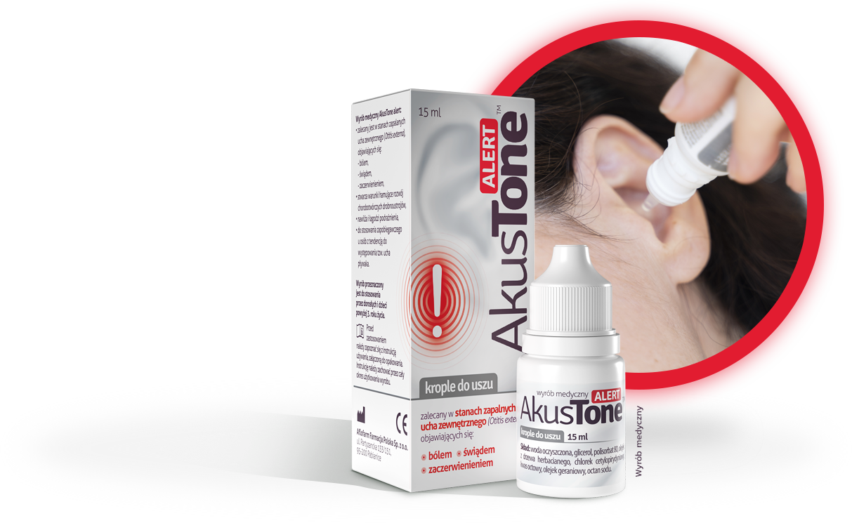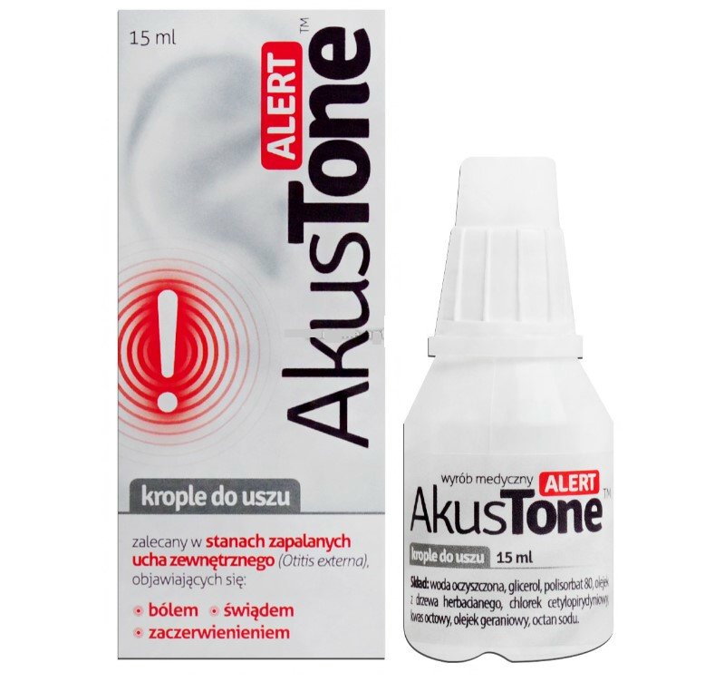 AkusTone Alert to wyrób medyczny przeznaczony do stosowania w stanach zapalnych ucha zewnętrznego, które objawiają się bólem, świądem i zaczerwienieniem. Preparat tworzy w zewnętrznej części przewodu słuchowego warunki, które przeciwdziałają rozwojowi drobnoustrojów, takich jak bakterie i grzyby. Krople zawierają olejki eteryczne które, wykazują działanie zapobiegające rozwojowi drobnoustrojów, a zawarty glicerol działa nawilżająco, łagodząco na powstałe podrażnienia oraz zmiękczająco na czop woskowinowy, dzięki czemu ułatwione zostaje jego usunięcie.
