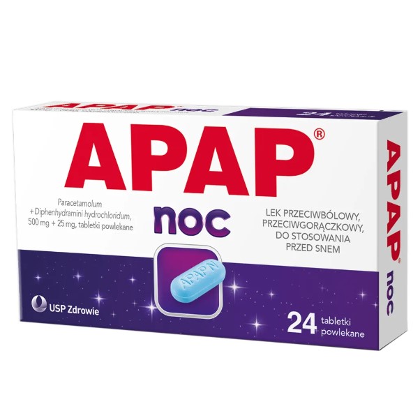 Lek Apap® Noc 500 mg + 25 mg stosuje się od 12. roku życia w krótkotrwałym leczeniu bólów powodujących trudności w zasypianiu, w tym: bólu głowy, bólów kostno-stawowych, bólu mięśni, bólu zębów, nerwobóli, bólów menstruacyjnych, bólów związanych z przeziębieniem i grypą.