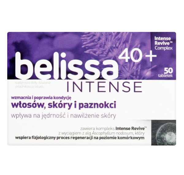 Belissa Intense 40+ to suplement diety stworzony z myślą o dojrzałych kobietach. Zawarta w produkcie witamina C pomaga w produkcji kolagenu w celu zapewnienia prawidłowego funkcjonowania skóry. Dodatkowo zawarty w preparacie wyciąg ze skrzypu polnego wzmacnia i poprawia kondycję włosów, skóry i paznokci a biotyna, cynk, ryboflawina i niacyna pomagają zachować zdrową skórę. Belissa Intense 40+ jest wzbogacona kompleksem Intense Revive, zawierającym wyciąg z alg Ascophyllum nodosum, który pomaga skórze zachować równowagę, korzystnie wpływa na jej jędrność i nawilżenie oraz wspiera fizjologiczny proces regeneracji już na poziomie komórkowym.