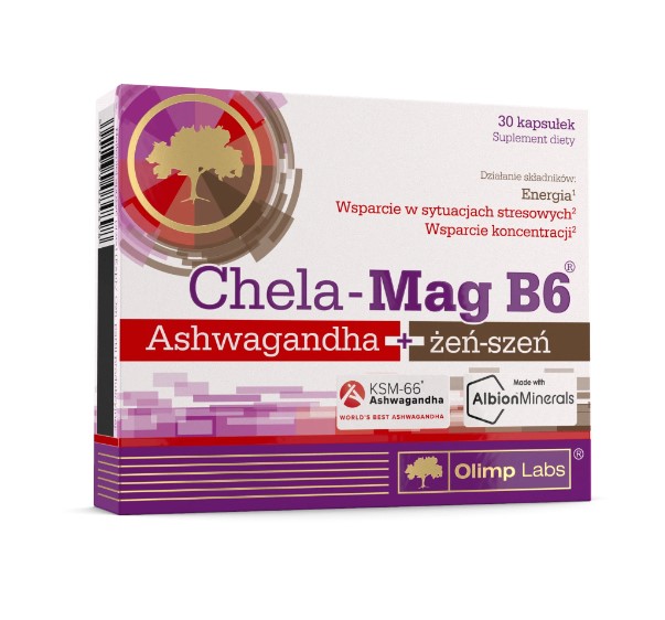 Chela-Mag B6 Ashwagandha + żeń szeń od Olimp Labs® to suplement diety w kapsułkach zawierający wysoko przyswajalny chelatowany magnez Albion™. Formuła preparatu została dodatkowo uzupełniona o witaminę B6 oraz standaryzowane ekstrakty z ashwagandhy i żeń-szenia syberyjskiego.