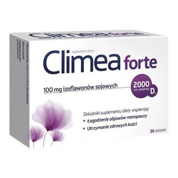 Climea Forte to suplement diety, którego składniki zostały dobrane z myślą o kobietach, w celu łagodzenia objawów menopauzy. Produkt zawiera w składzie izoflawony sojowe, wyciąg z szyszek chmielu, nasiona lnu oraz dodatkowo witamin D, B6, E, kwas foliowy i wapń. Składniki aktywne preparatu: