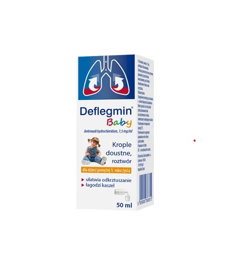 Deflegmin Baby to lek mukolityczny w postaci kropli doustnych, zawierający jako substancję czynną chlorowodorek ambroksolu. Deflegmin Baby zwiększa wydzielanie śluzu w drogach oddechowych i poprawia jego transport, w efekcie ułatwiając odkrztuszanie i łagodząc kaszel. Stosuje się go zwykle w chorobach płuc (zwłaszcza ostrych i przewlekłych), które przebiegają z kaszlem i trudnościami w odkrztuszaniu.