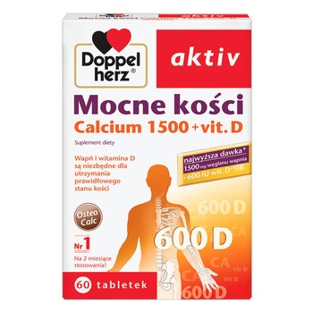 Doppelherz aktiv Mocne kości Calcium 1500 + vit. D to trzyskładnikowy suplement diety w postaci tabletek łączący w składzie wapń, witaminę D3 i witaminę K. Każda tabletka zawiera wysoką ilość 1500 mg węglanu wapnia (600 mg wapnia) oraz 600 j.m. witaminy D.