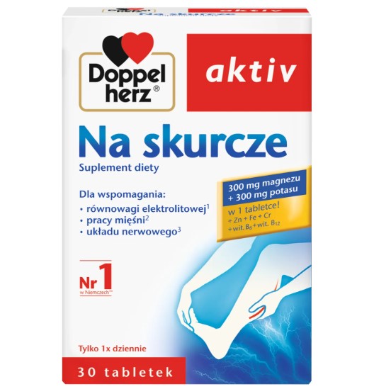 Tabletki Doppelherz® aktiv Na Skurcze polecane są do stosowania zwłaszcza w przypadku utraty elektrolitów w wyniku pocenia się i intensywnego wysiłku fizycznego, jak również w stanach zmęczenia i znużenia. Chcesz uzyskać korzystny efekt wynikający z deklarowanego działania? Stosuj każdego dnia 1 tabletkę magnezowo-potasową marki Doppelherz® aktiv i ciesz się zdrowiem organizmu.