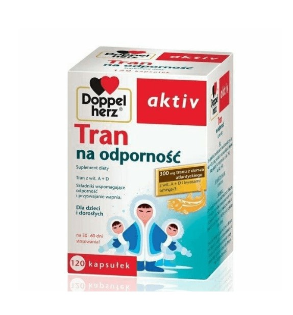 Doppelherz Aktiv Tran na odporność to suplement diety przeznaczony dla dzieci powyżej 6 roku życia oraz dorosłych. Zawiera zamknięty w kapsułkach tran z dorsza atlantyckiego.