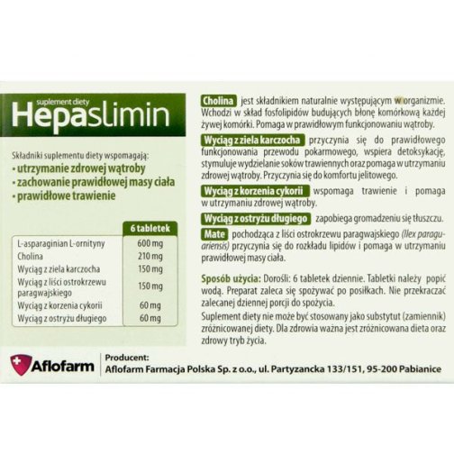 Cholina jest składnikiem naturalnie występującym w organizmie. Wchodzi w skład fosfolipidów budujących błonę komórkową każdej żywej komórki. Pomaga w prawidłowym funkcjonowaniu wątroby. Wyciąg z ziela karczocha przyczynia się do prawidłowego funkcjonowania przewodu pokarmowego, wspiera detoksykację, stymuluje wydzielanie soków trawiennych oraz pomaga w utrzymaniu zdrowej wątroby. Przyczynia się do komfortu jelitowego. Wyciąg z korzenia cykorii wspomaga trawienie i pomaga w utrzymaniu zdrowej wątroby. Wyciąg z ostryżu długiego zapobiega gromadzeniu się tłuszczu. Mate pochodząca z liści ostrokrzewu paragwajskiego (Ilex paraguariensis) przyczynia się do rozkładu lipidów i pomaga w utrzymaniu prawidłowej masy ciała.