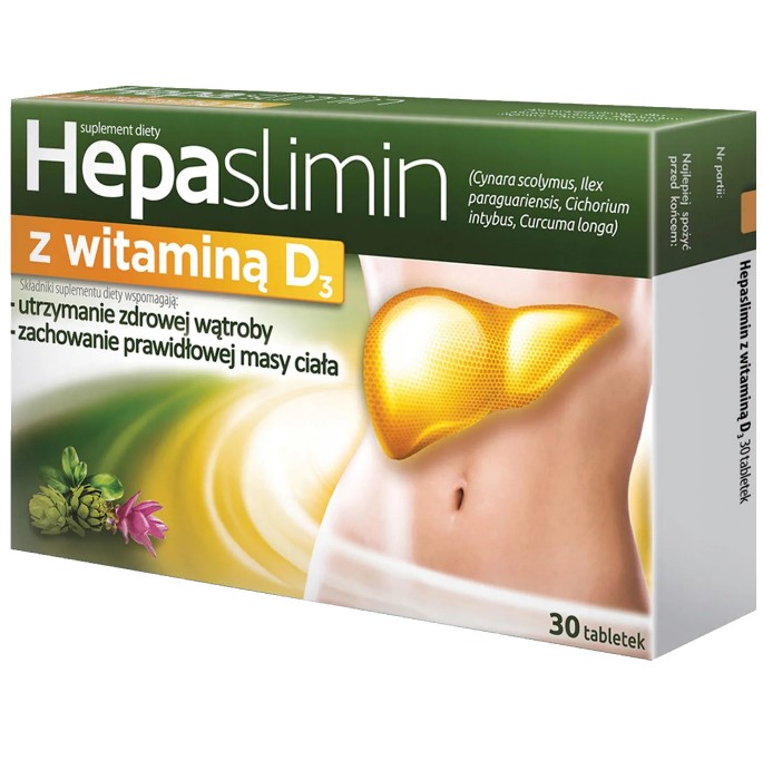 Hepaslimin z witaminą D3 to suplement diety w postaci tabletek powlekanych łączący w składzie cztery wyciągi roślinne, cholinę i L-asparaginian L-ornityny. Formuła preparatu została uzupełniona o wysoką porcję witaminy D w formie cholekalcyferolu.