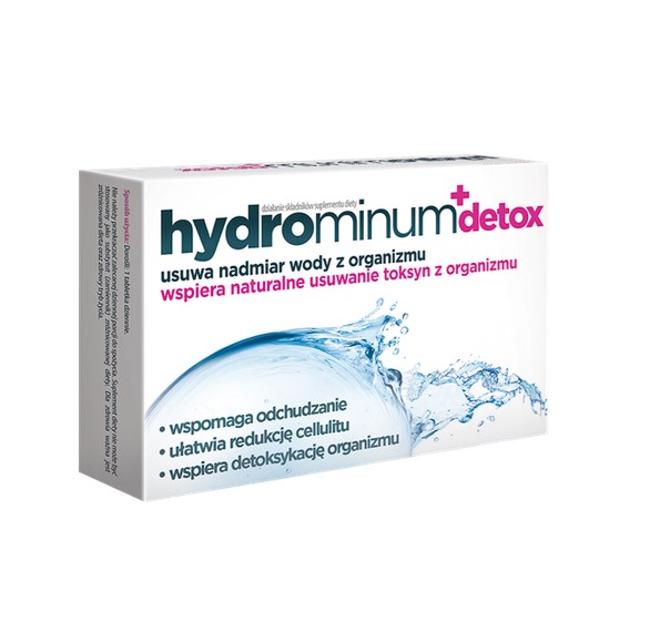 Hydrominum + Detox to suplement diety w postaci tabletek, który łączy w składzie 8 składników roślinnego pochodzenia, w tym wyciąg z opuncji figowej, mniszka lekarskiego, ziela pokrzywy, zielonej herbaty, nasion winogron, ziela nawłoci, ostrokrzewu i brodziuszki.