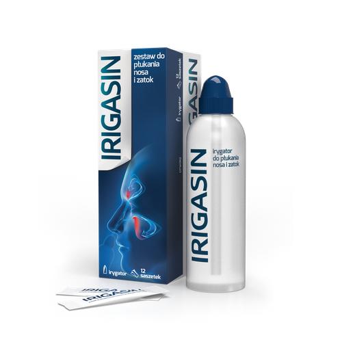 Irigasin to wyrób medyczny przeznaczony do przygotowania roztworu do płukania nosa i zatok. W skład zestawu wchodzi 12 saszetek, które umożliwiają sporządzenie izotonicznego lub hipertonicznego roztworu oraz miękka butelka pełniąca rolę irygatora.