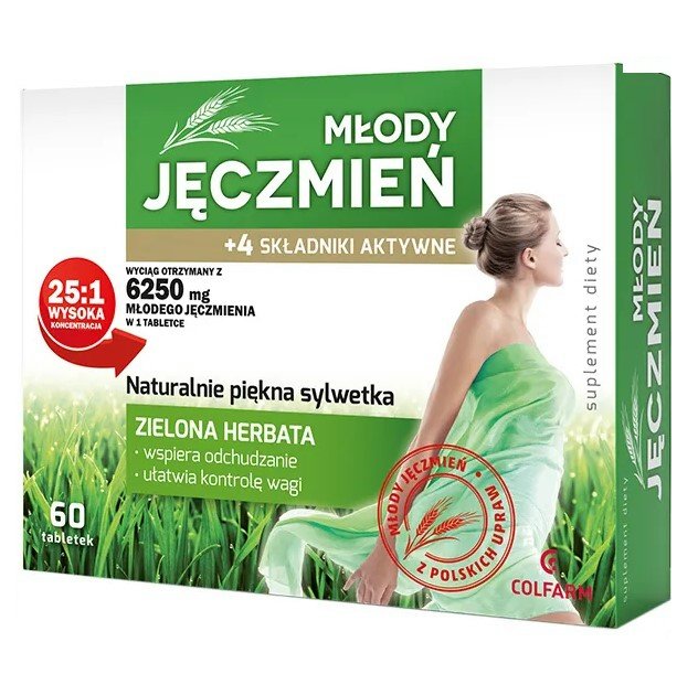 Młody jęczmień jest składnikiem cenionym od dawna za swoje właściwości. Składnik ten posiada charakterystyczną zieloną barwę, którą zawdzięcza obecności chlorofilu. Młody jęczmień może być włączony do codziennej, odpowiednio zbilansowanej diety w postaci soku, rozdrobnionej trawy jęczmiennej, lub w postaci tabletek z ekstraktem. W preparacie marki Colfarm zastosowano wyciąg z jęczmienia o wysokim stopniu koncentracji (25:1). Oznacza to, że ilość składnika aktywnego w jednej tabletce, tj. 250 mg została otrzymana z ilości odpowiadającej 6,25 g suszonego młodego jęczmienia.
