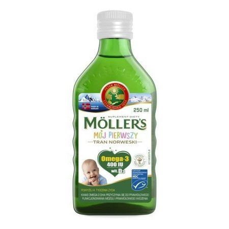 Mój Pierwszy Tran Norweski od Moller’s to suplement diety w płynie zawierający olej z wątroby dorsza, odpowiedni do stosowania u niemowląt powyżej 1 miesiąca życia i małych dzieci. Obecny w składzie olej z wątroby dorsza stanowi naturalne bogate źródło kwasów omega-3 (DHA i EPA) oraz witaminy D3. Witamina D jest potrzebna do prawidłowego wzrostu i rozwoju kości u dzieci. Wspiera również prawidłowe funkcjonowanie układu odpornościowego u dzieci. Kwas DHA wsiera prawidłowy rozwój wzroku u niemowląt do 12 miesiąca życia (przy dziennym spozyciu 100 mg DHA) oraz wspiera utrzymanie prawidłowego funkcjonowania mózgu i prawidłowego widzenia (przy dziennym spozyciu 250 mg DHA).