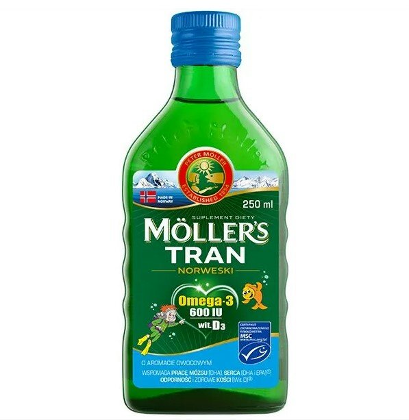 Moller’s Tran Norweski 350 ml to suplement diety o owocowym aromacie wyprodukowany na bazie oleju z wątroby dorsza. Preparat zawiera nienasycone kwasy tłuszczowe omega-3 (DHA, EPA) oraz witaminy – witaminę A,witaminę D i witaminę E.