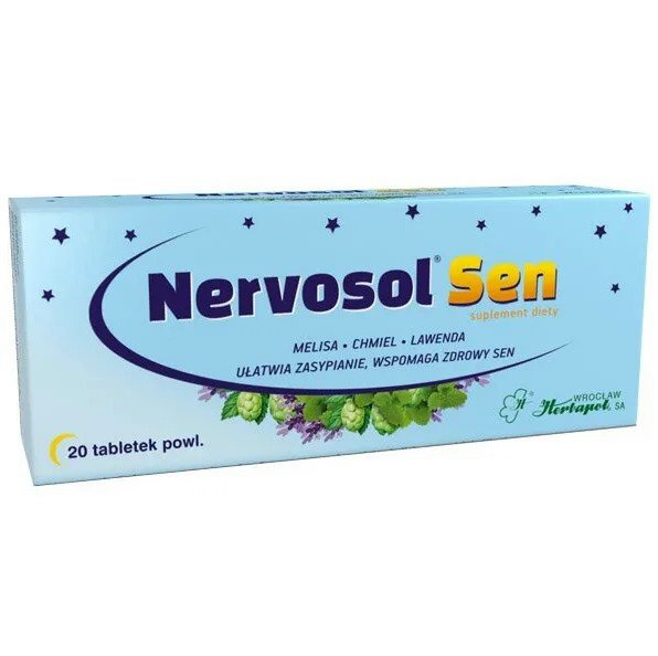 Nervosol sen to suplement diety dla dorosłych w postaci tabletek, w którego składzie znajdują się wyciągi roślinne, takie jak: