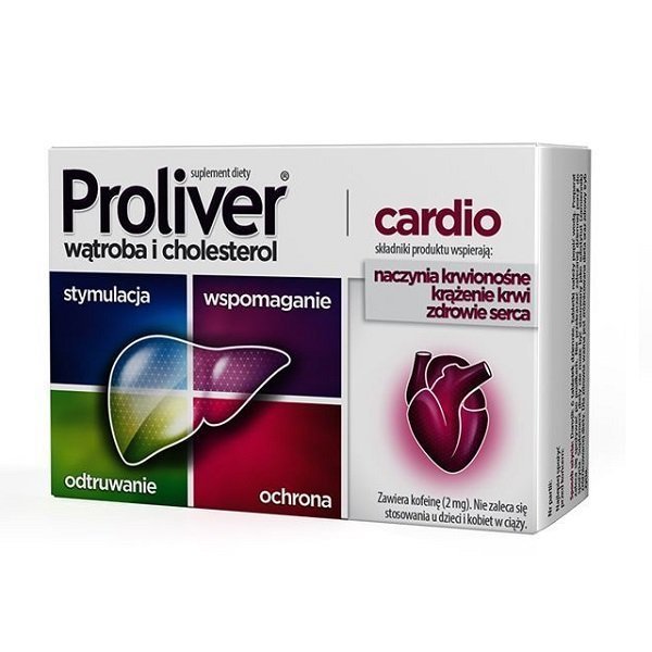 Proliver Cardio to suplement diety w postaci tabletek zawierający wyciągi z: zielonej herbaty, liści karczocha, korzenia cykorii, liści ostrokrzewu paragwajskiego, owocu glogu , ostryżu długiego oraz L-asparaginian L-ornityny i cholinę.