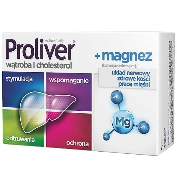 Proliver + Magnez to wieloskładnikowy suplement diety w postaci tabletek z wysoką zawartością magnezu. Zawarty w preparacie magnez wspomaga funkcjonowanie układu nerwowego, wspiera prawidłową syntezę białka, jest pomocny w utrzymaniu równowagi elektrolitowej oraz zmniejsza uczucie zmęczenia i znużenia. Cholina wspiera utrzymanie prawidłowego metabolizmu tłuszczów, wspomaga prawidłowe funkcjonowanie wątroby oraz bierze udział w prawidłowym utrzymaniu metabolizmu homocysteiny. Działanie wyłącznie w odniesieniu do żywności zawierającej przynajmniej 82,5 mg choliny na 100 g lub 100 ml, lub na pojedynczą porcję żywności.