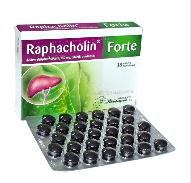 Raphacholin® Forte to leki w postaci tabletek powlekanych zawierający kompozycję kwasu dehydrocholowego z dodatkiem wyciągu z czarnej rzodkwi. Substancja aktywna produktu leczniczego wykazuje działanie żółciopędne, czyli zwiększające objętość widzialnej żółci w wątrobie oraz przyspieszające jej transport do dwunastnicy. Zwiększona ilość żółci pobudza pracę jelita grubego, dzięki czemu preparat posiada łagodne działanie przeczyszczające.