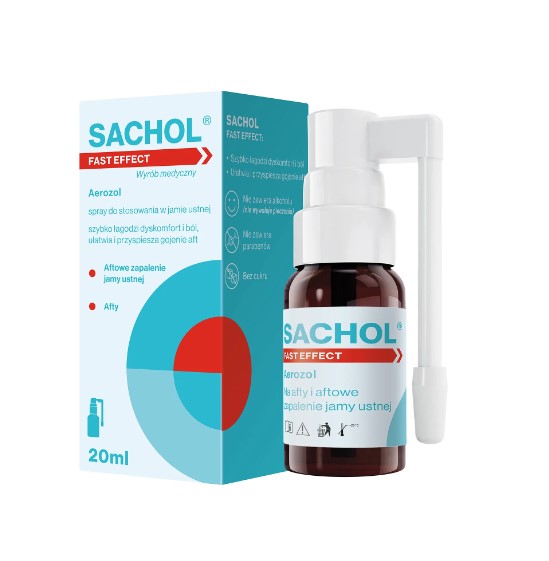 Sachol® Fast Effect to preparat w postaci aerozolu w butelce z dozownikiem. Wyrób medyczny do stosowania w jamie ustnej przeznaczony jest dla osób dorosłych.