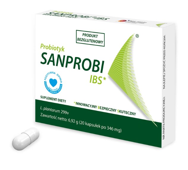 Sanprobi IBS to suplement diety w kapsułkach zawierający w swoim składzie unikalny szczep żywych dobroczynnych bakterii Lactobacillus plantarum 299v. Szczep ten jest naturalnym składnikiem mikroflory jelitowej człowieka. Preparat nie wymaga przechowywania w lodówce, dzięki czemu może stanowić uzupełnienie diety w dobroczynne bakterie również w trakcie dalekich podróży. Formuła może być z powodzeniem stosowana przez całą rodzinę: jest bezpieczna dla dzieci powyżej 3 roku życia, kobiet w ciąży i matek karmiących, a także dla osób zaburzeniami układu odpornościowego.