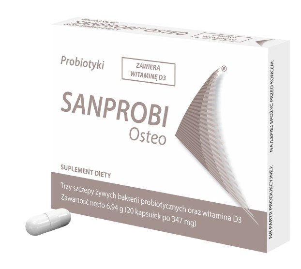 Suplement diety Sanprobi Osteo to połączenie trzech szczepów bakterii z grupy Lactobacillus oraz witaminy D3. Zawarta w preparacie witamina D pomaga w prawidłowym funkcjonowaniu układu odpornościowego i bierze udział w procesie podziału komórek. Wspiera prawidłowe wchłanianie i wykorzystywanie wapnia i fosforu oraz utrzymaniu prawidłowego poziomu wapnia we krwi. Pomaga również w utrzymywaniu zdrowych kości i zębów oraz wspomaga prawidłowe funkcjonowanie mięśni.