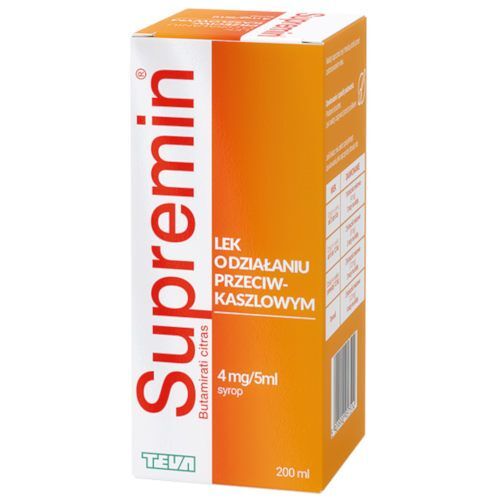 Supremin jest to produkt leczniczy przeciwkaszlowy, wskazany do stosowania w ostrym, suchym kaszlu. Produkt do stosowania u dorosłych i dzieci w wieku od 2 lat. Substancja aktywna (butamiratu cytrynian) zawarta w leku jest substancją przeciwkaszlową. Łagodzi kaszel poprzez ośrodkowe hamowanie odruchu kaszlu nieproduktywnego (suchego, męczącego), zmniejszając jego częstotliwość oraz natężenie. Butamiratu cytrynian działa obwodowo poprzez nieznaczne rozszerzenie oskrzeli w mechanizmie cholinolitycznym, co może ułatwiać oddychanie.