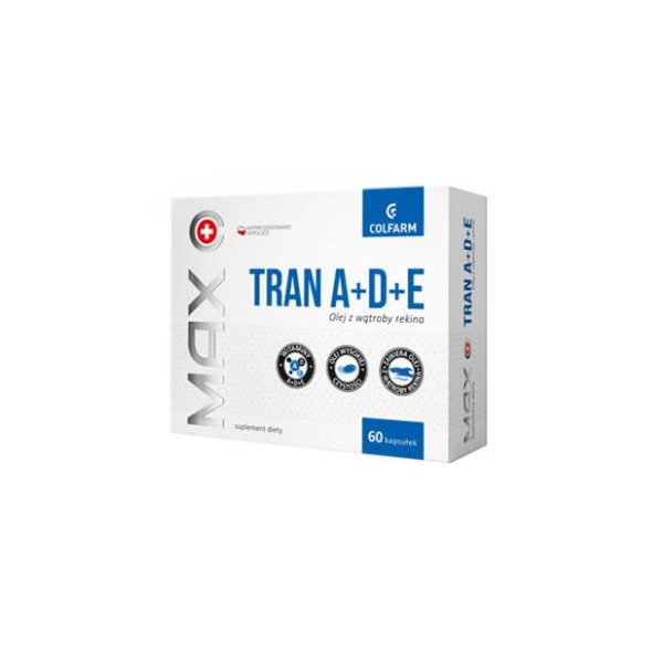 Suplement diety Tran z witaminami A+D+E to produkt w postaci kapsułki miękkich zawierających wysokiej jakości czysty olej z wątroby rekina oraz witaminy A, D i E.