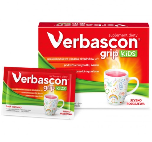 Verbascon® Grip Kids to suplement diety w postaci saszetek z proszkiem o malinowym smaku. Preparat do rozpuszczania w wodzie jest polecany jako uzupełnienie diety dzieci od 3 roku życia oraz dorosłych, w szczególności w okresie jesienno-zimowym.
