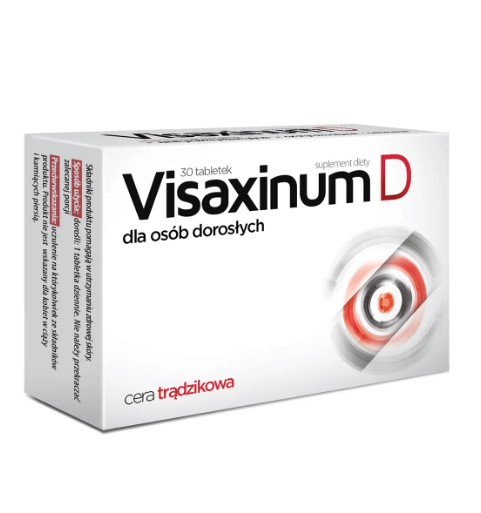 Visaxinum D to suplement diety w postaci tabletek przeznaczony dla osób dorosłych z cerą trądzikową. Formuła produktu łączy w sobie naturalne wyciągi roślinnego pochodzenia, w tym z ziela fiołka trójbarwnego, korzenia mniszka lekarskiego, liści zielonej herbaty, liści gurmaru, kłącza ostryżu długiego, ziela melisy uzupełnionych o cynk, niacynę oraz witaminę B6.