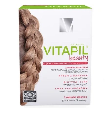 Vitapil® Beauty to suplement diety w postaci kapsułek opracowany z myślą o osobach dorosłych, które pragną zadbać o zdrowie włosów i dobrą kondycję skóry głowy. Każda kapsułka to kompozycja 15 starannie dobranych składników. Zawiera witaminy i składniki mineralne, które uzupełniono dodatkowo o aminokwasy, sproszkowane pędy bambusa zawierające 75% krzemionki i hialuronian sodu.